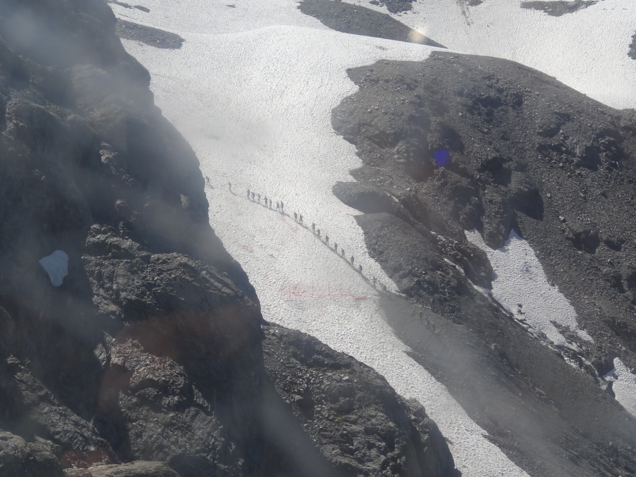 Il y a nettement moins de neige qu’il y a deux ans, le glacier est bien la devant nous mais nous n’irons pas le fouler.
