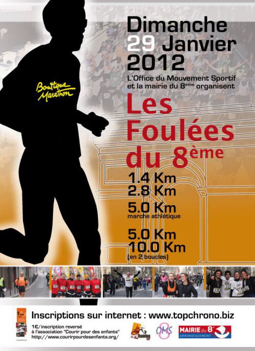 Outre les Foulées de Vincennes qui sont inscrites à notre calendrier le 02 février 2012 – et pour lesquelles il reste encore quelques dossards – il y a plus proche : Le dimanche 29 Janvier prochain se dérouleront les Foulées du 8ème à Paris (le même jour que les Chpts Rég de Cross à Montesson – zone Ouest).
